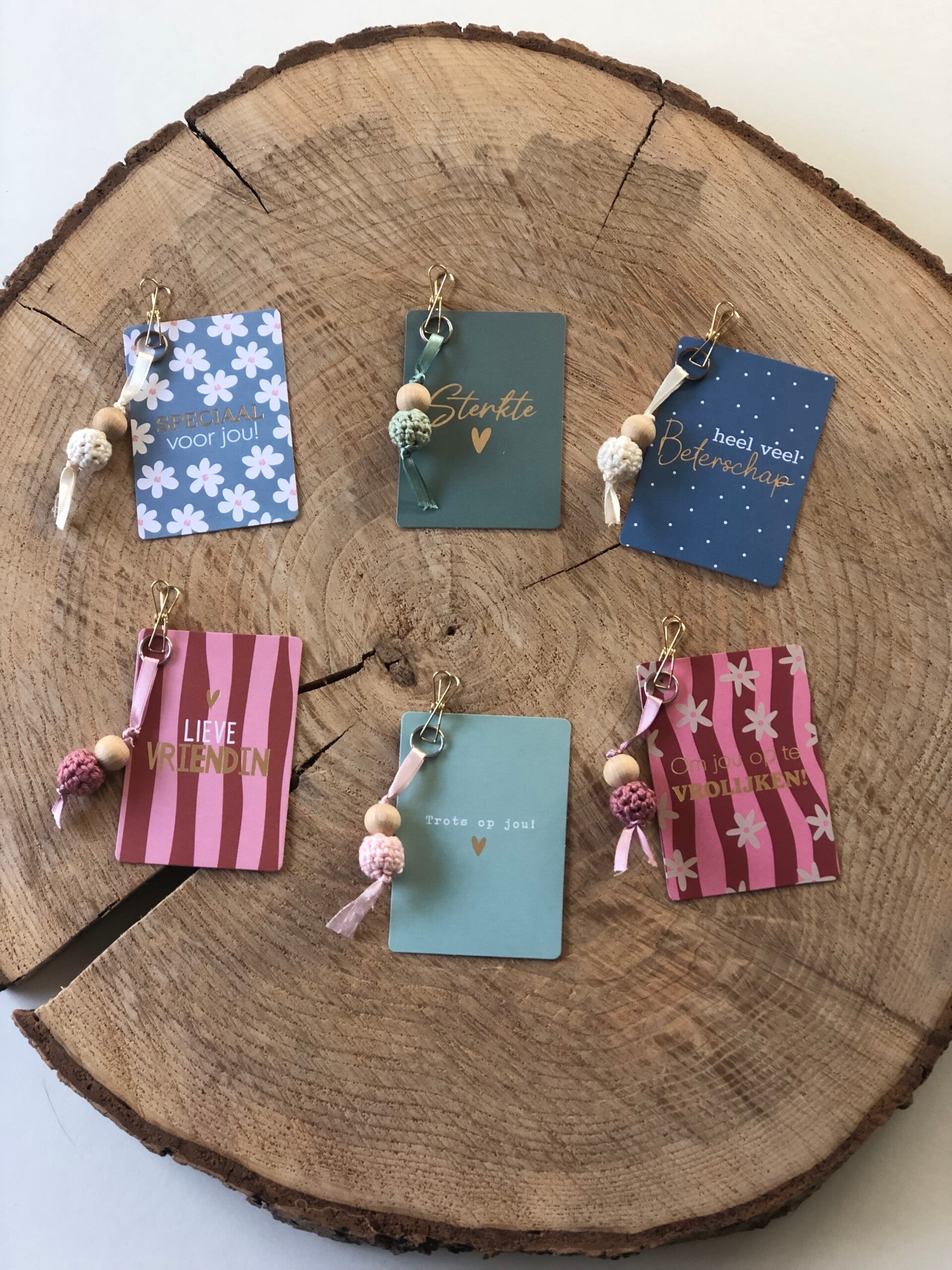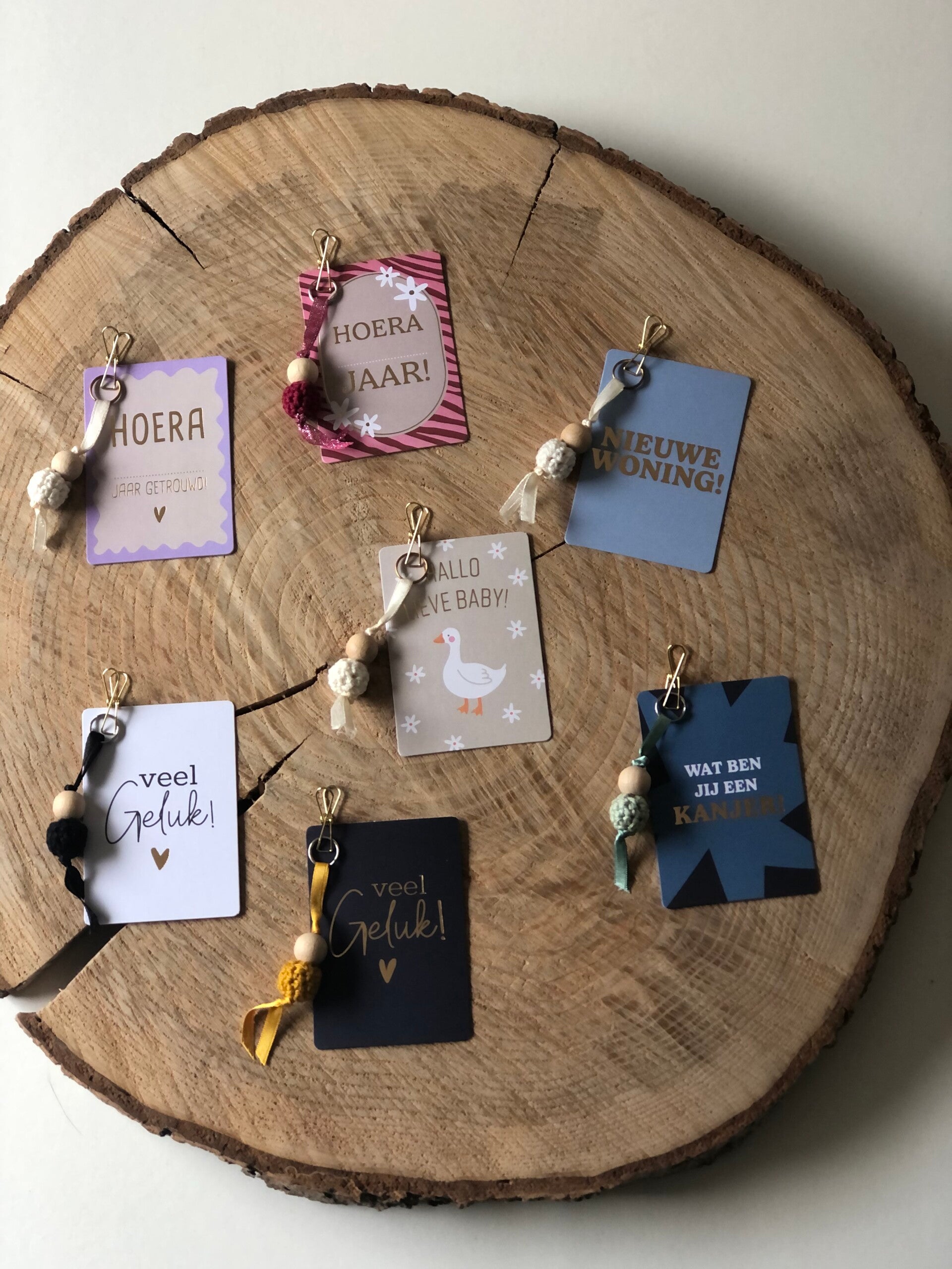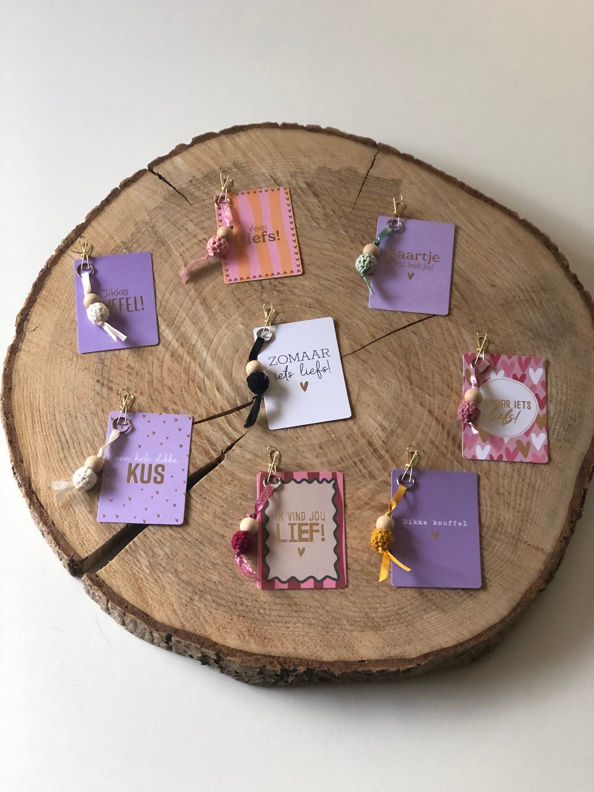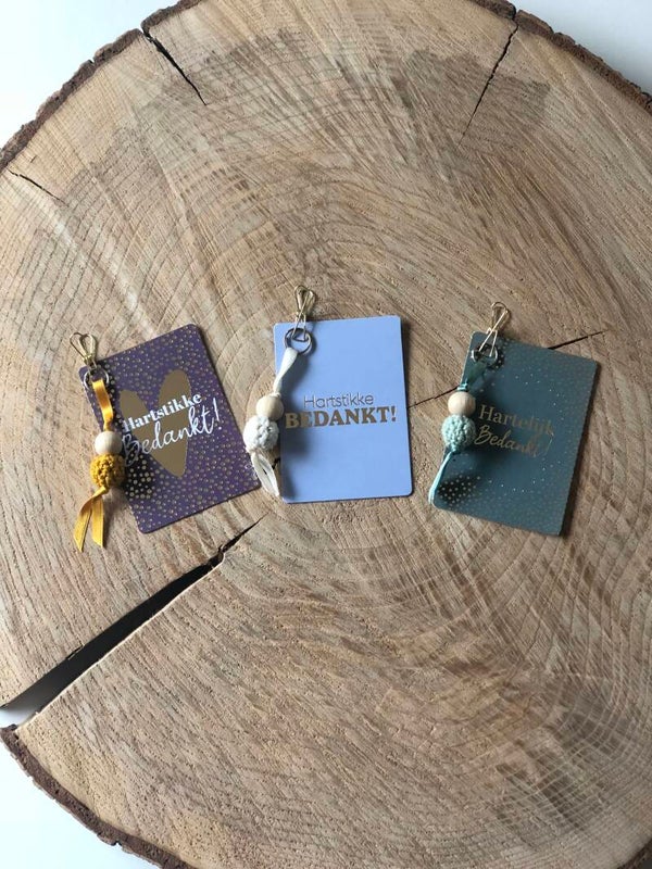 Gelukspoppetje met kaartje, knijper oud of rosé gouid en sleutelring zilver of goud. Diverse leuke, lieve teksten of alleen met een hartje